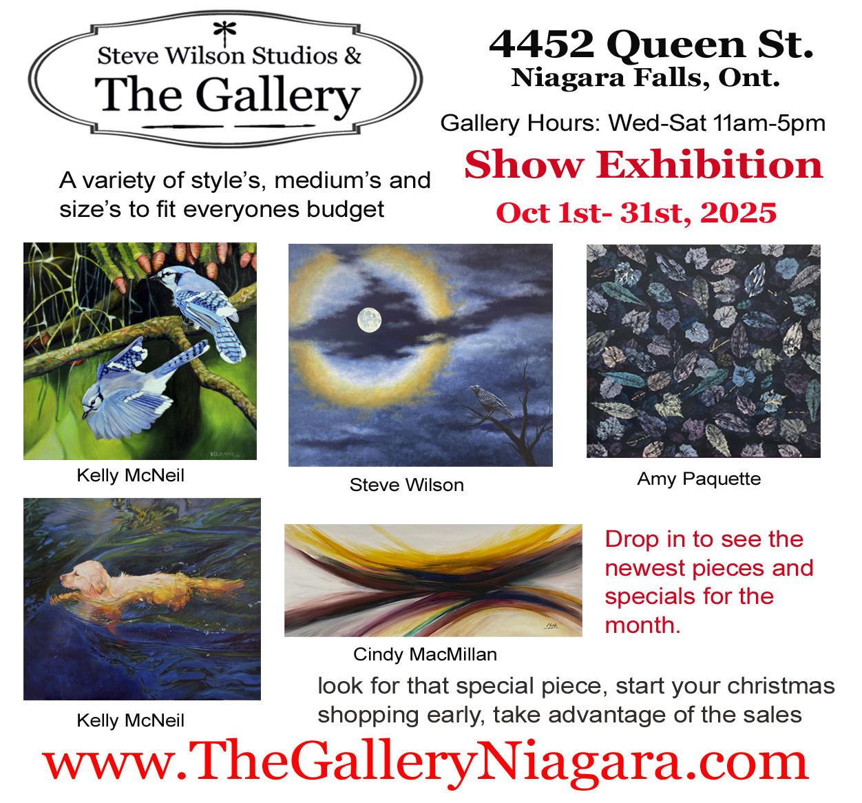 The gallery artist’s works are on display at the gallery at 4452 Queen St. in Niagara, Falls, presenting artist, Gwen Tooth, Kelly McNeil, Cindy MacMillan, Amy Paquette and Steve Wilson Drop by the gallery to check out new works,  A mixture of realism, modern abstract, expressionism, ranging from landscape,  figurative, still life, city scape and landscape, in various sizes and prices